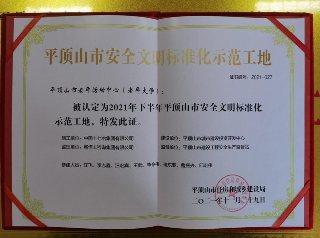 12月2日,从平顶山市住房和城乡建设局获悉,由中国十七冶集团承建的平顶山市“四馆一中心”项目老年活动中心工程被评为2021年下半年平顶山市建筑工程安全文明标准化示范工地。