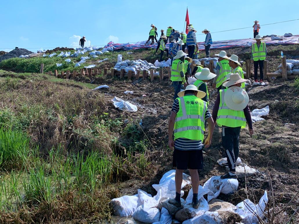 三伏天火辣辣的太阳蒸腾着大堤,热浪滚滚,即使不走动,在堤上站上几分钟,也会汗流浃背。抢险突击队员们在38℃高温闷热的环境下,挥汗如雨,拿起编织袋、铁秋,装砂石的装砂石,运沙袋的运沙袋,齐心协力,众志成城抗击洪水,和水位比高度,与洪峰比速度,不断加高加固圩堤。现场累计装运8200袋石子,堤坝加高30公分,加长300米,有效抵御了高水位的浸泡强压,防止堤坝塌方,得到政府部门的一直好评。